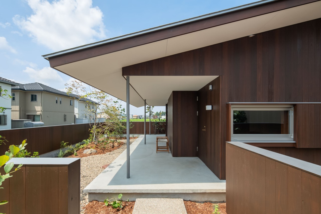 建物は緩い片流れ屋根を持つ1.5階建てのようなプロポーション。