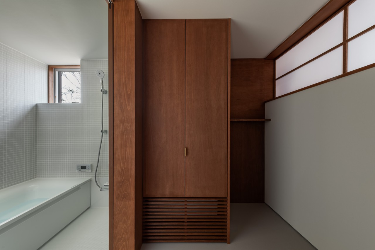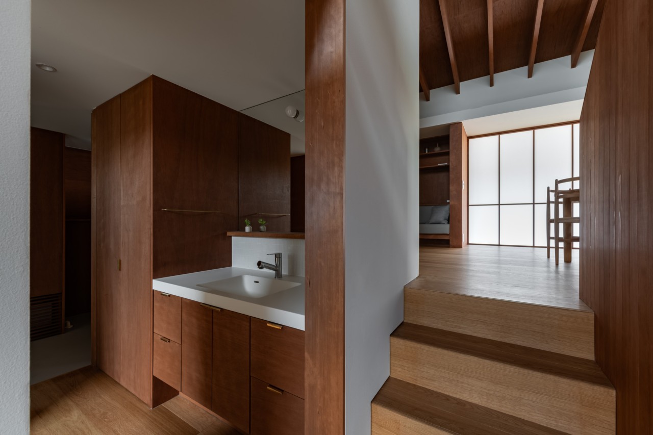 3層階のスキップフロアは、ダイニングから上を見上げればワークスペース越しに庭の樹木と空が目に映り、半地下部分にはハーフユニットバスや脱衣室、洗面、トイレ、個室と、プライベートなゾーンが並びます。