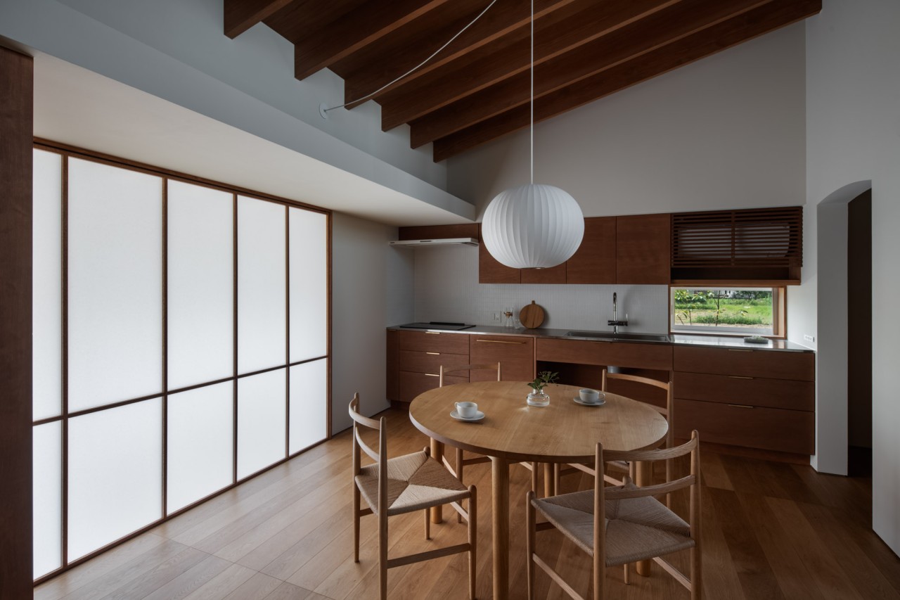 田畑に囲まれ長閑な風景が広がる地域。農地転用の期間を経て、ご実家の隣に5人家族の住まいを建築させていただきました。