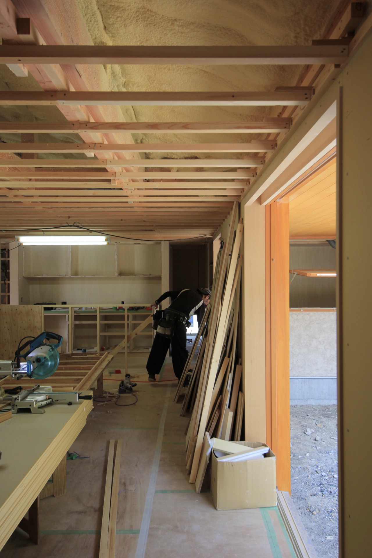 キッチン造作→シューズクローク→天井の檜材の施工といった流れで最後の追い込みです!