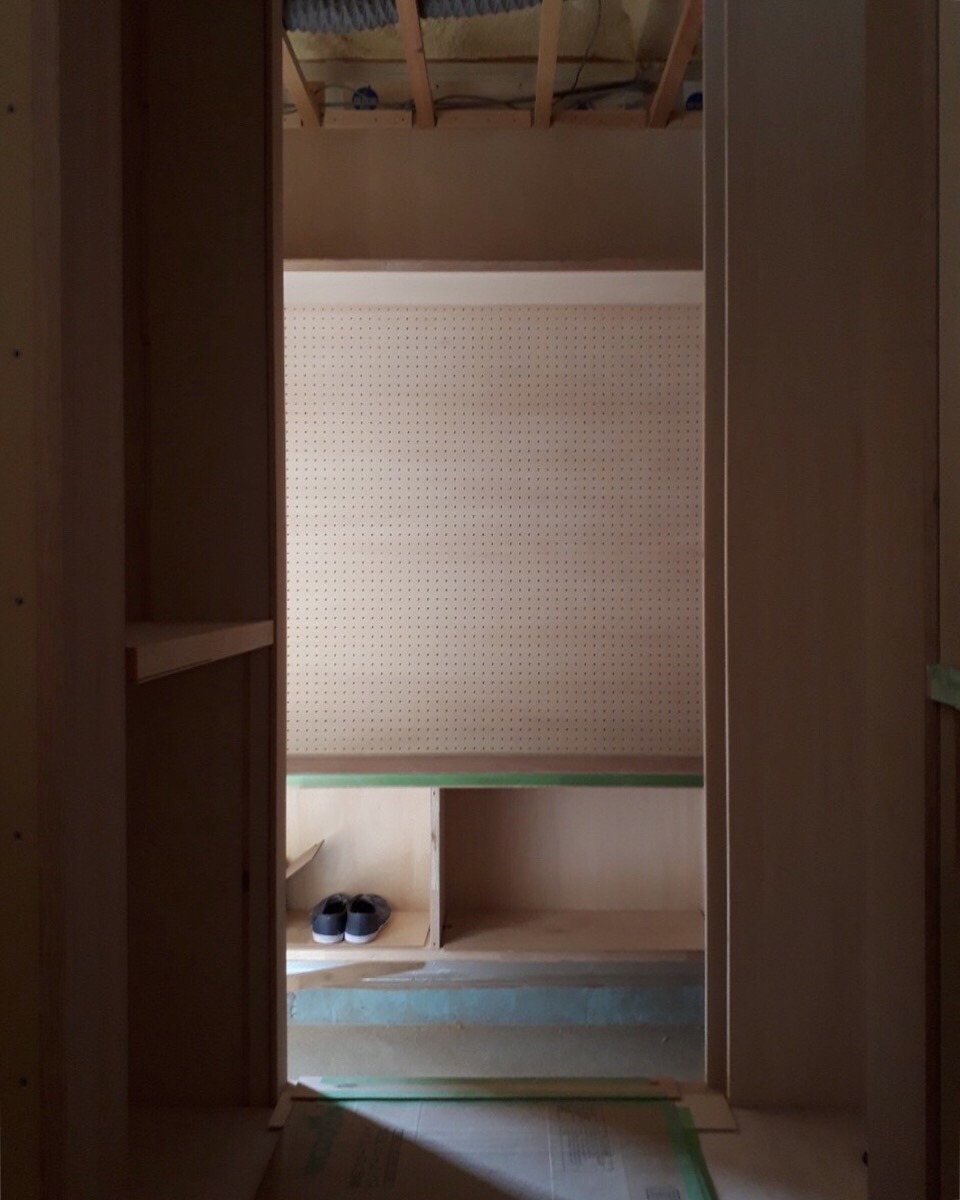 有孔ボード下は可動棚で靴収納。岡田大工が早速、靴を置いています(笑)