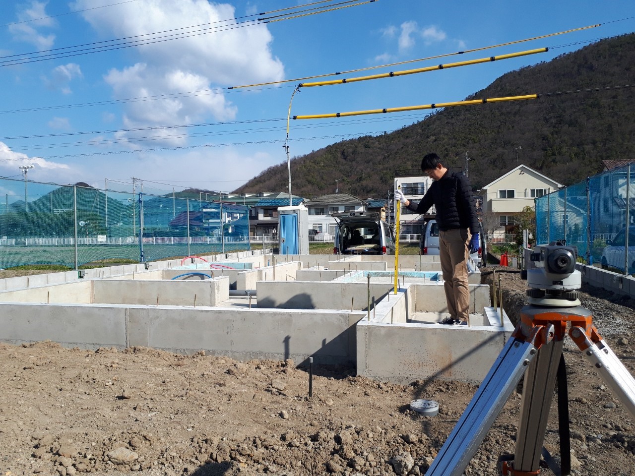 基礎の型枠をバラした後は基礎天端のレベルチェック。