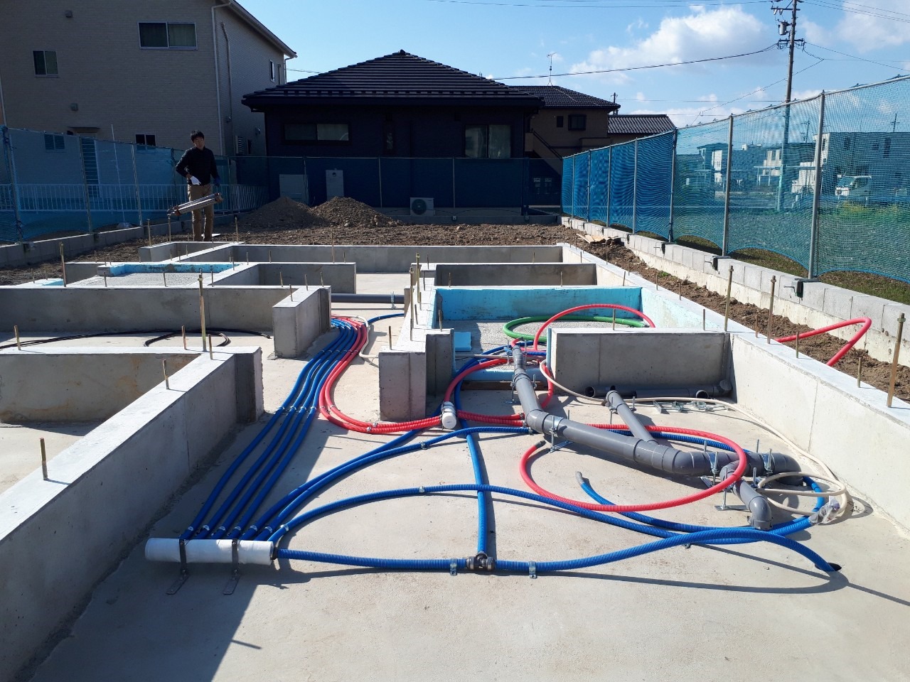 社内チェックが完了すると設備等の先行配管工事に入ります。