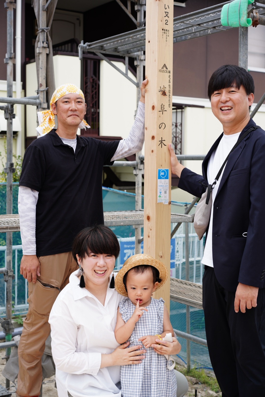 上棟の朝一番は、ご家族の皆さんの柱建てから上棟スタートです。