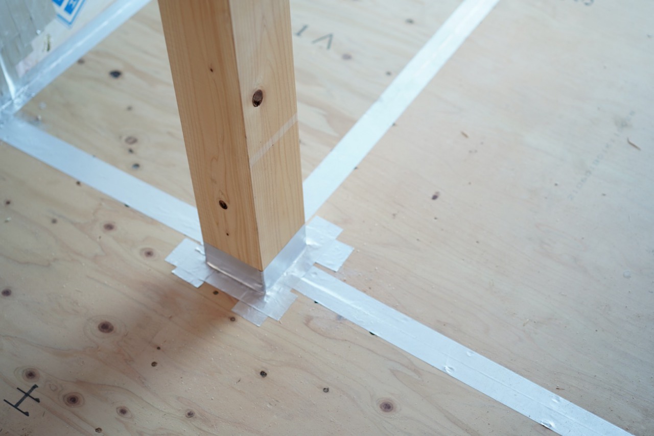 柱と断熱パネルの隙間を専用のアルミテープで塞いでいきます。