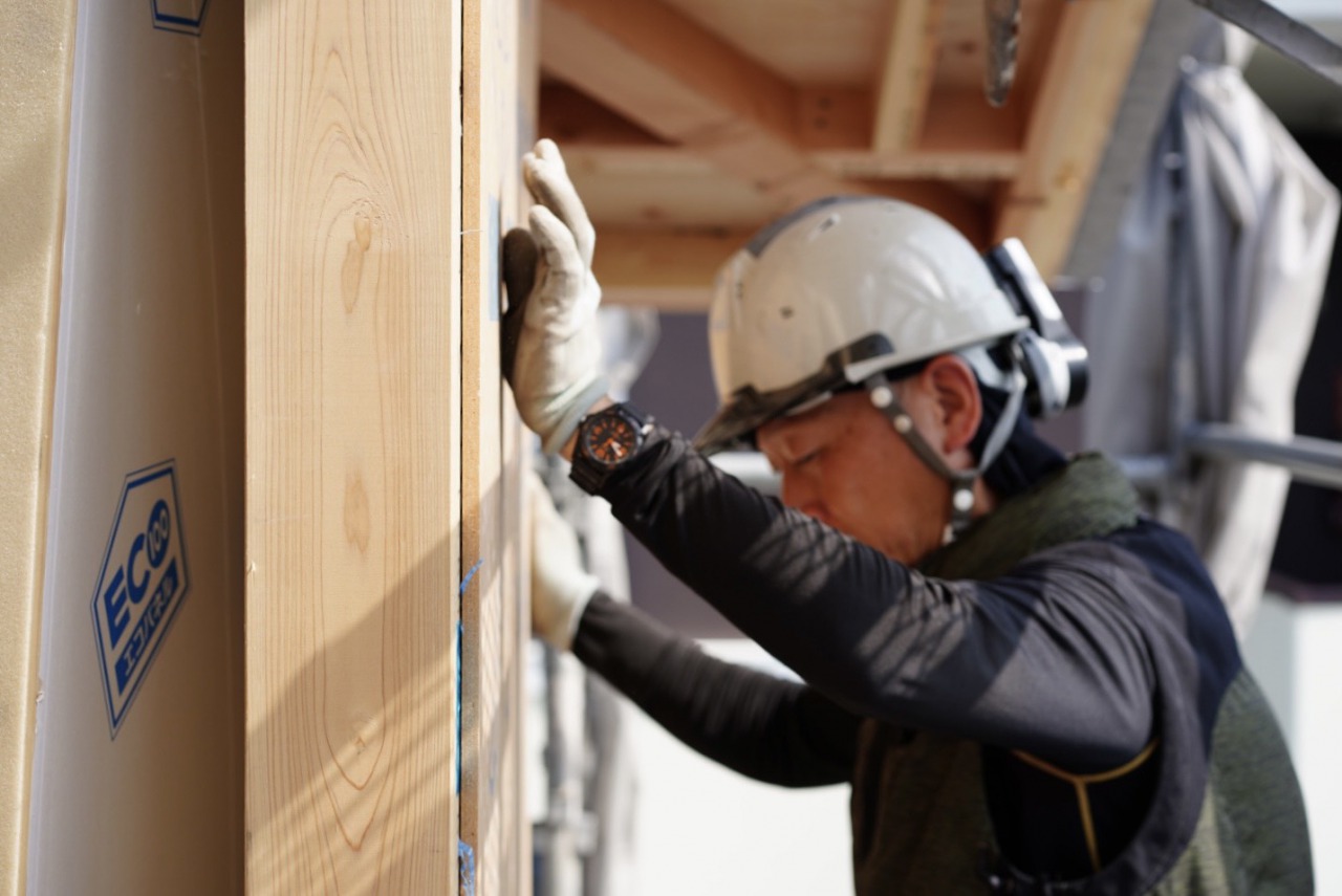 大工チームは、外部の構造用合板の施工を進めてくれています。