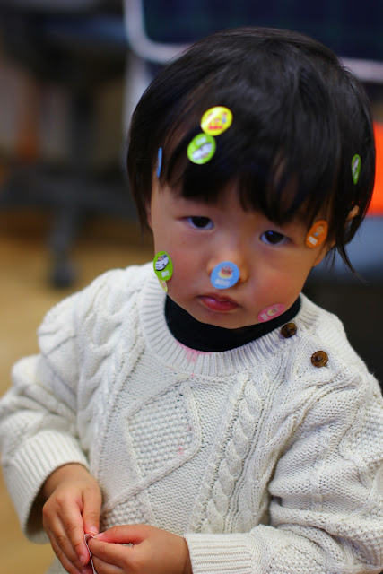 長女のかんなの最近の遊びは自分の顔にシールを貼っていきます(笑)