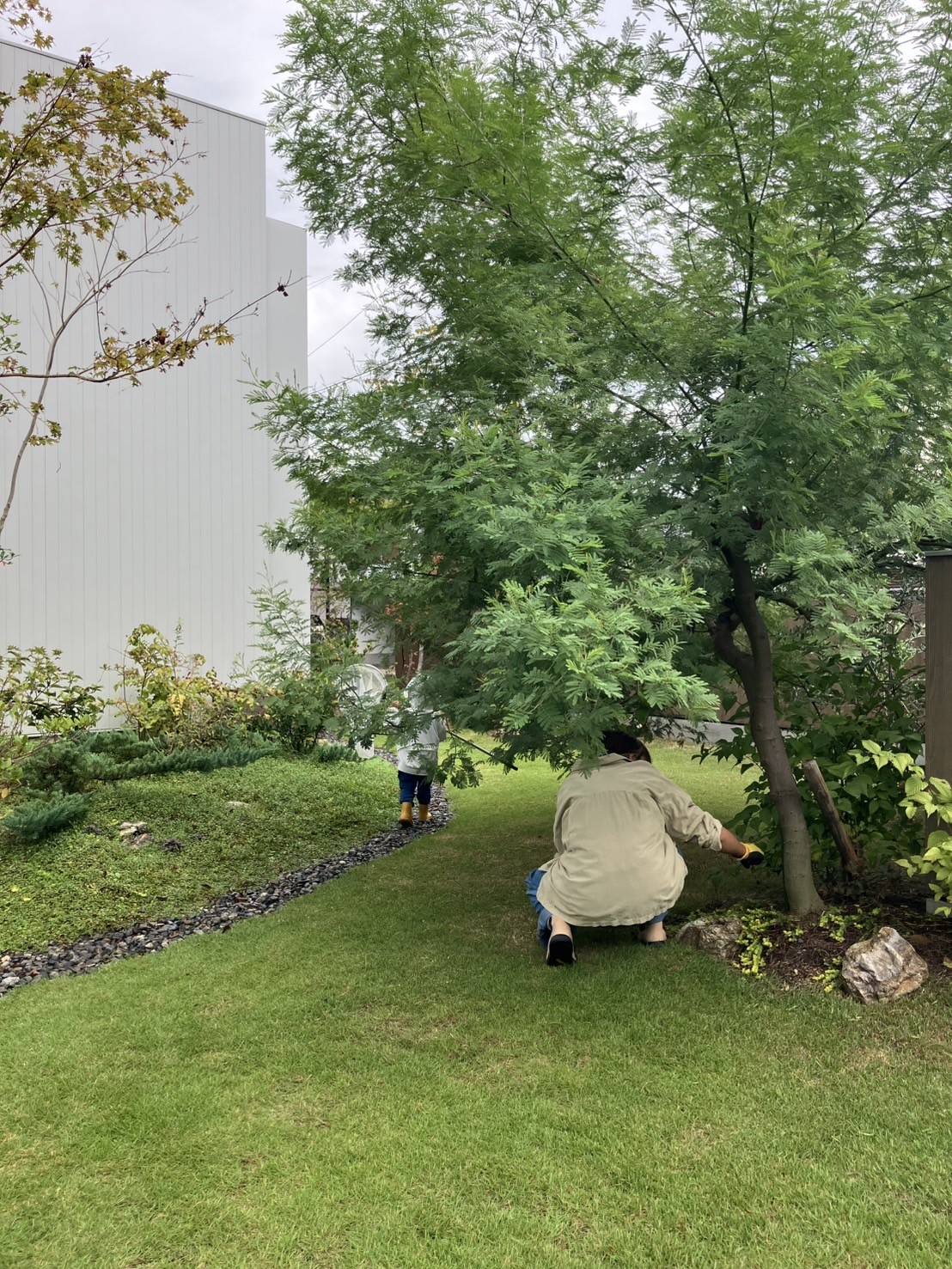 お庭の会中、息子さんがタモを片手に虫取りをしていました。このお庭にはたくさん虫がいて、虫取りが楽しいそうです。