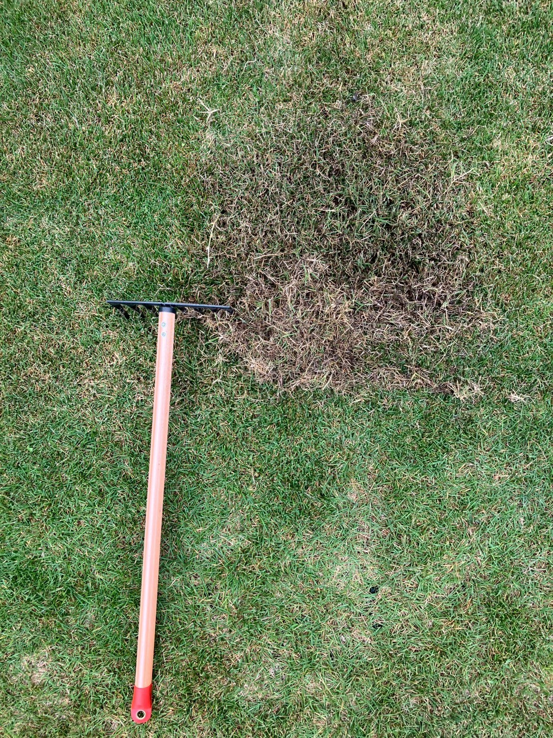 サッチ取り専用の道具で芝を掻き出していくのですが、この地道な作業を行ない芝に土を入れて休眠期を迎えると、翌年芝が元気に芽を出したり、また芝にサッチが溜まってうまく刈り込めないことを防ぐ効果もあるようです。
