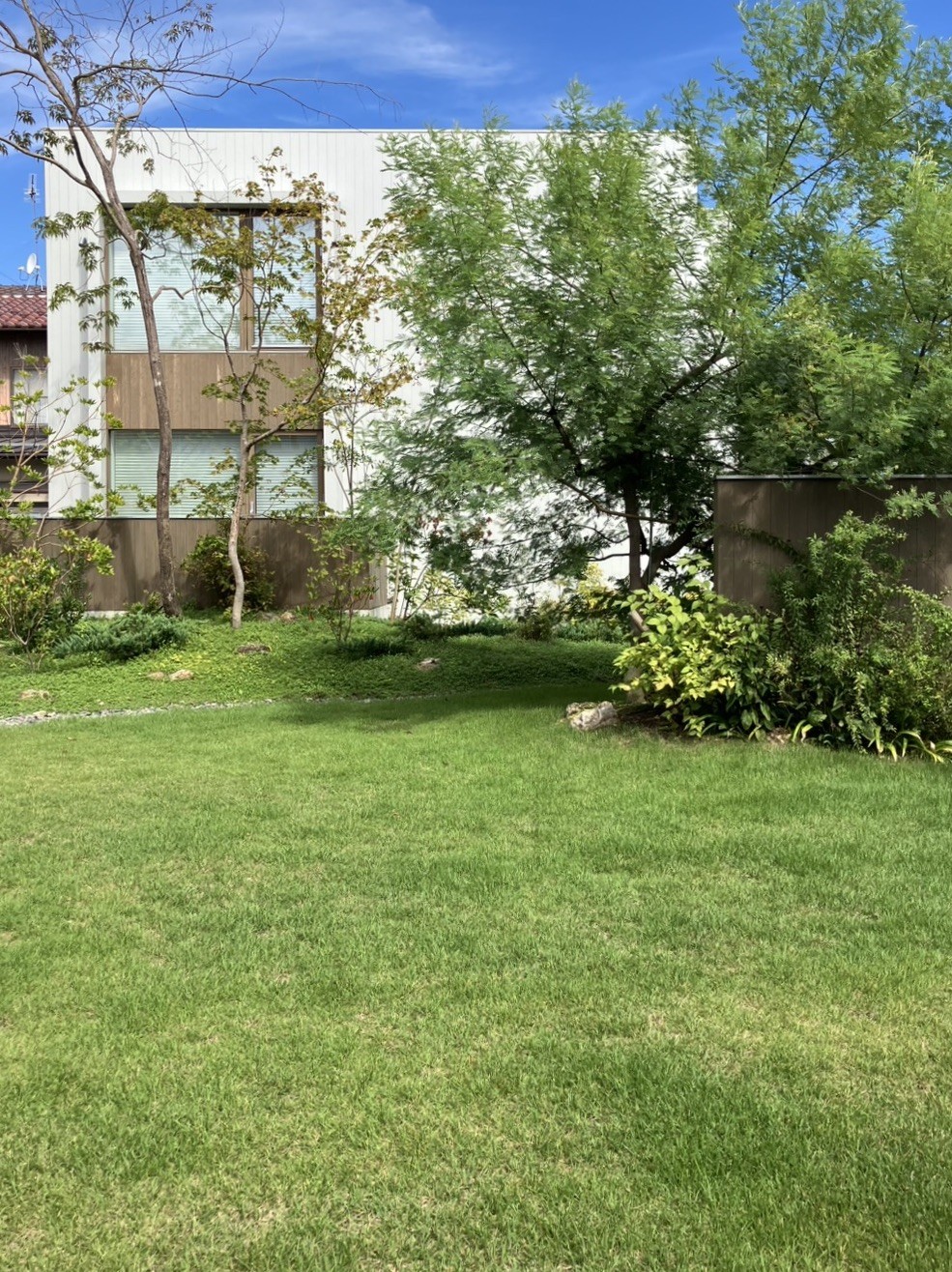 お庭の樹木や花々が綺麗に咲いていて、お庭の面積の半分以上を占める芝が青々と輝いています。