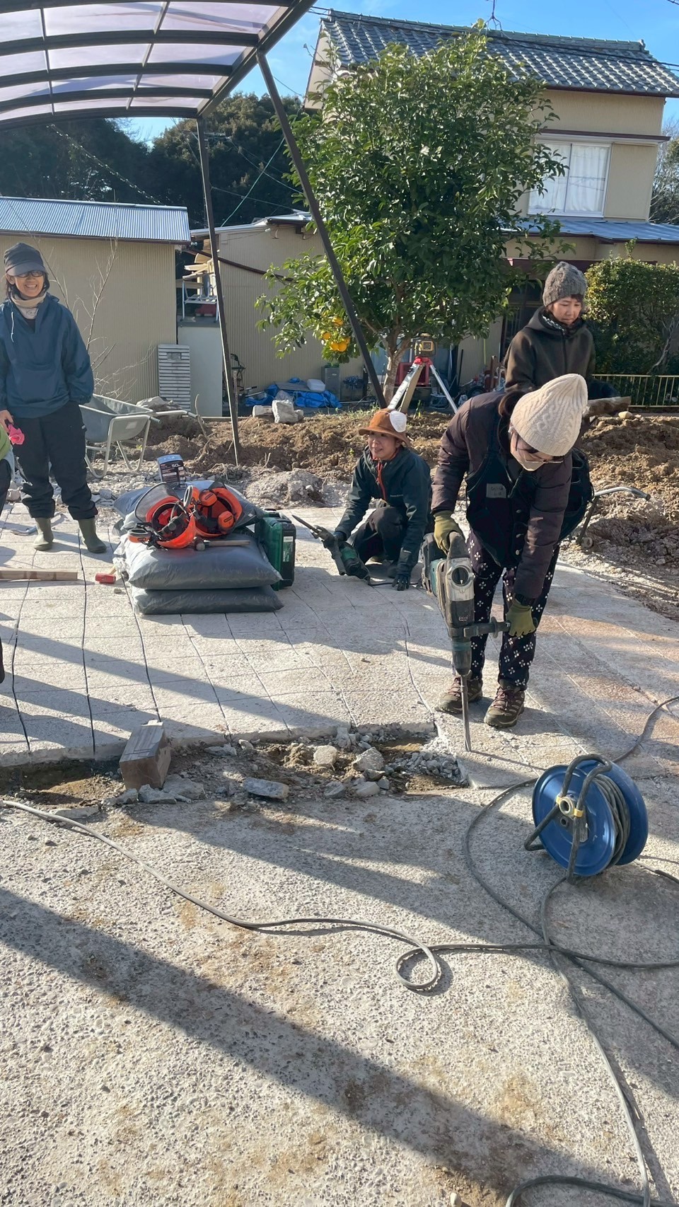中古住宅で使用されていたカーポート下の土間。目地を入れてはつった石は、お庭に再利用していきました。
