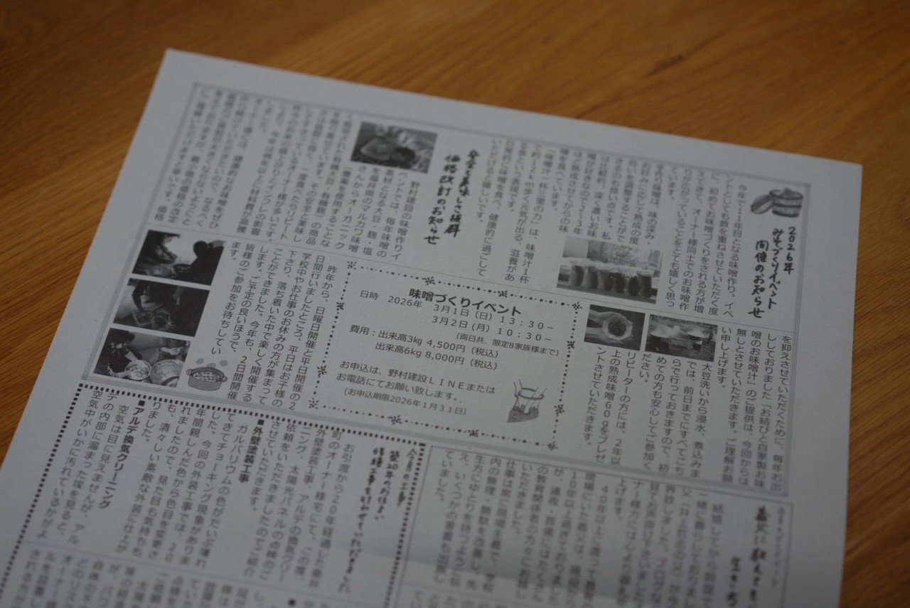 裏面にいは、味噌作りのイベントの告知からOB様の改修工事のご案内など掲載させていただいております。