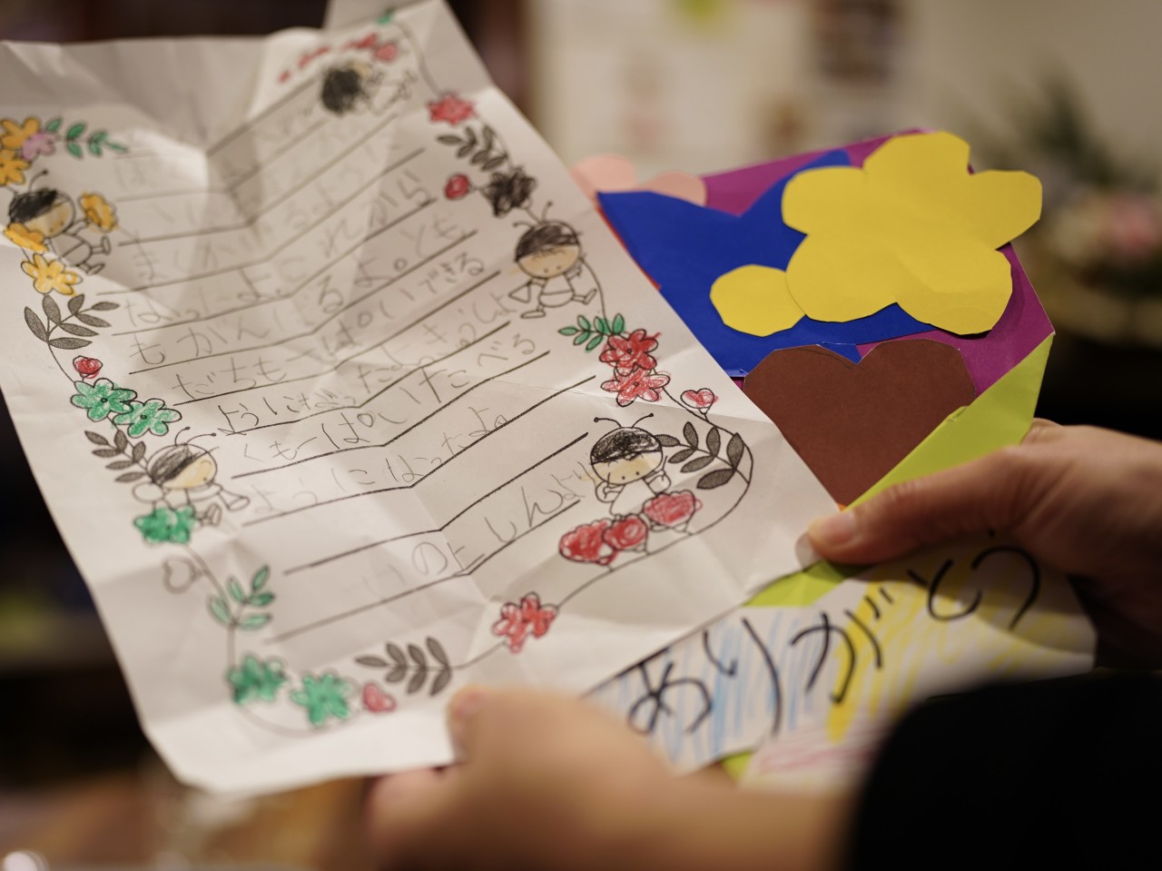 明代さんと私へ学校の授業で4日?!かけてつくった花束と手紙をくれました。