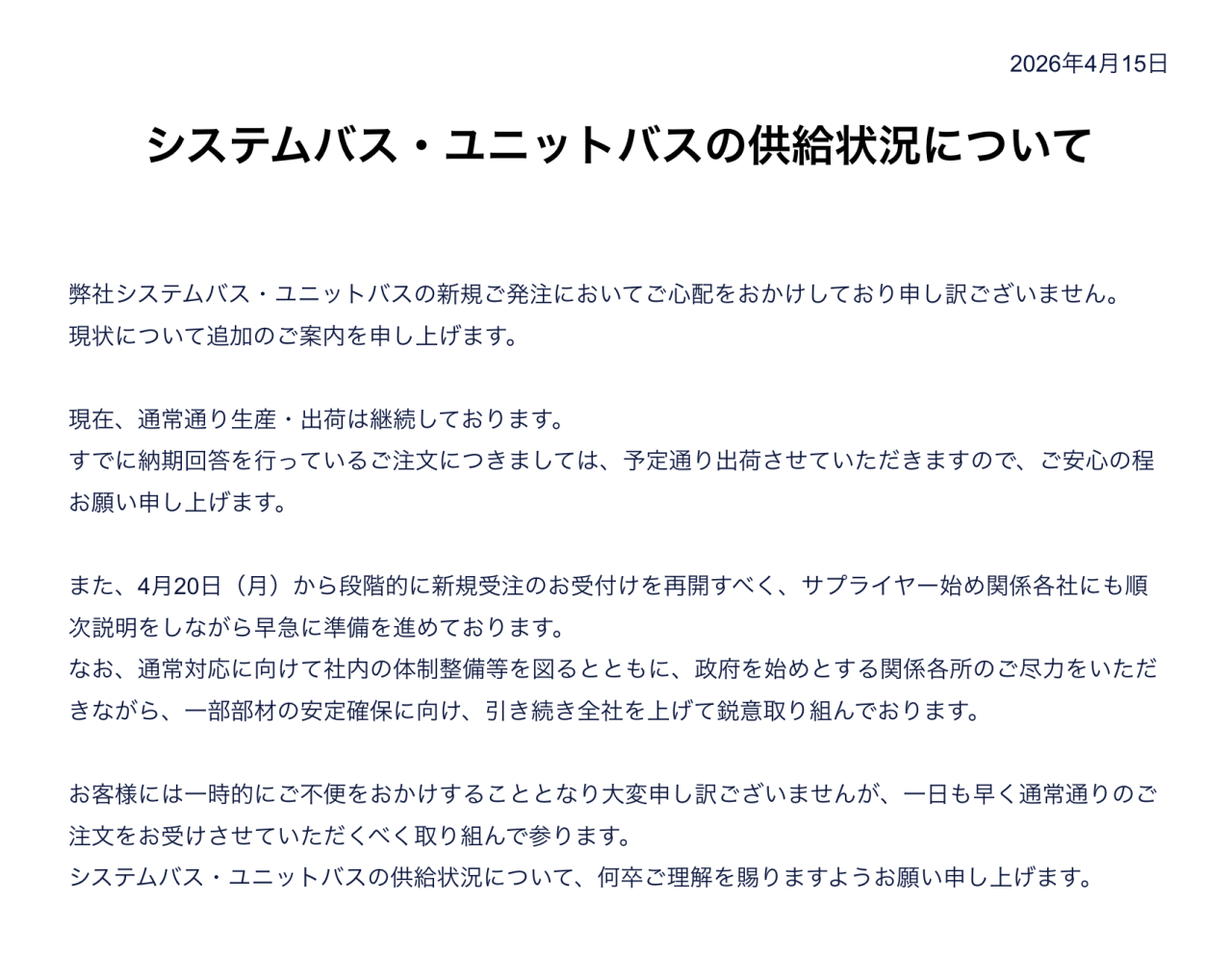 TOTO、LIXILのユニットバス受注停止の通達を受けて私たちもバタバタしていましたが、
