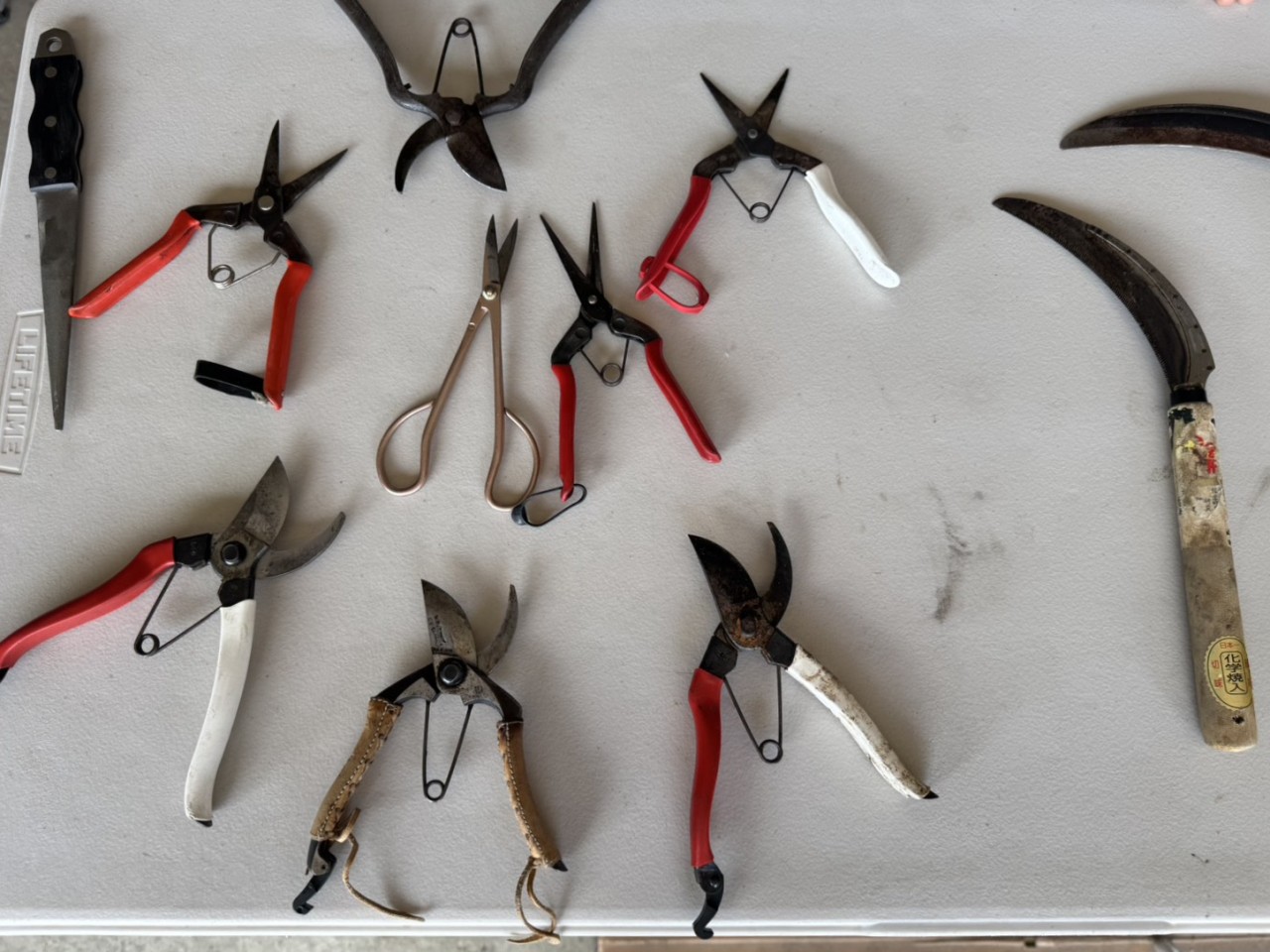 今回のお庭の会は、剪定ハサミのお手入れをメインとしていただきました。長年の汚れやサビが付いた剪定ハサミを知人の方から借りてきてくださって、手慣れた手つきでダイヤモンドシャープナーを使い研ぎ上げ、錆び取りやクリーナー、オイルで丁寧に仕上げていく。