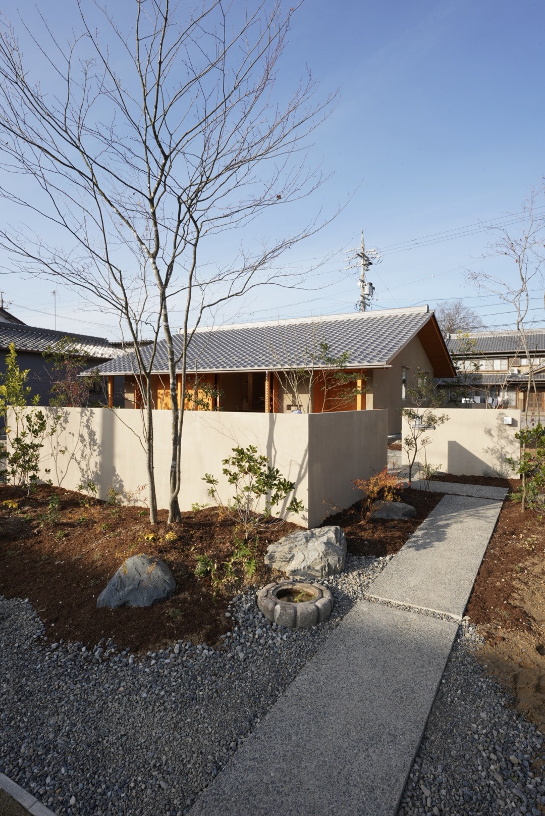 以前の住居の樹木や石を利用していることや外壁等が自然と馴染む素材感であることから、これまで長年住み慣れた地域に溶け込むような佇まいとなりました。