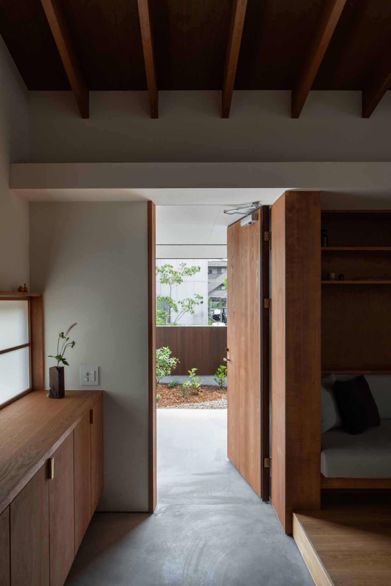 玄関から庭先までは土間つづきで、どちらからでもLDKに入って行けるような気軽さが家と庭との距離を近づけています。