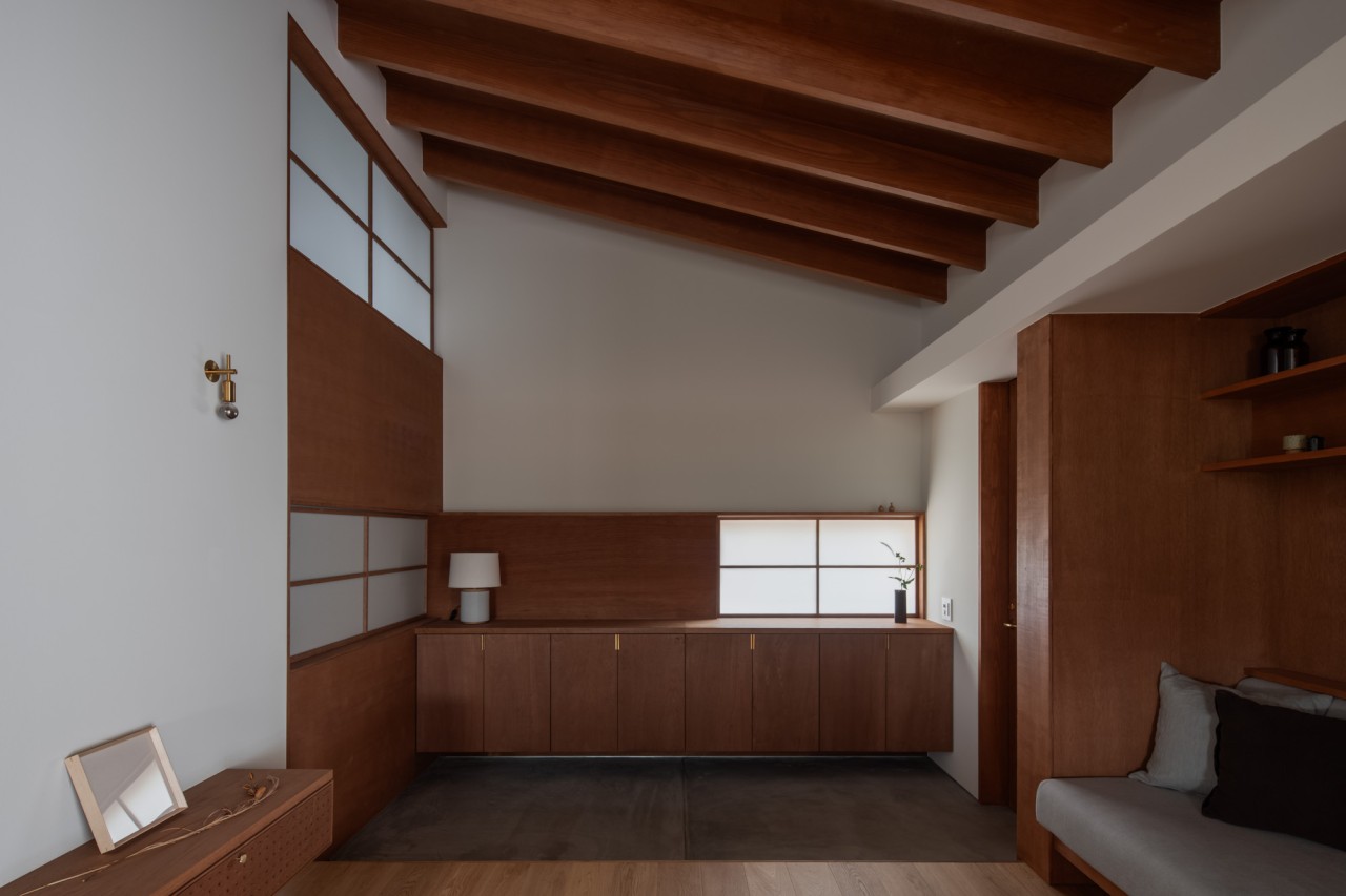 建物は緩い片流れ屋根を持つ1.5階建てのようなプロポーション。