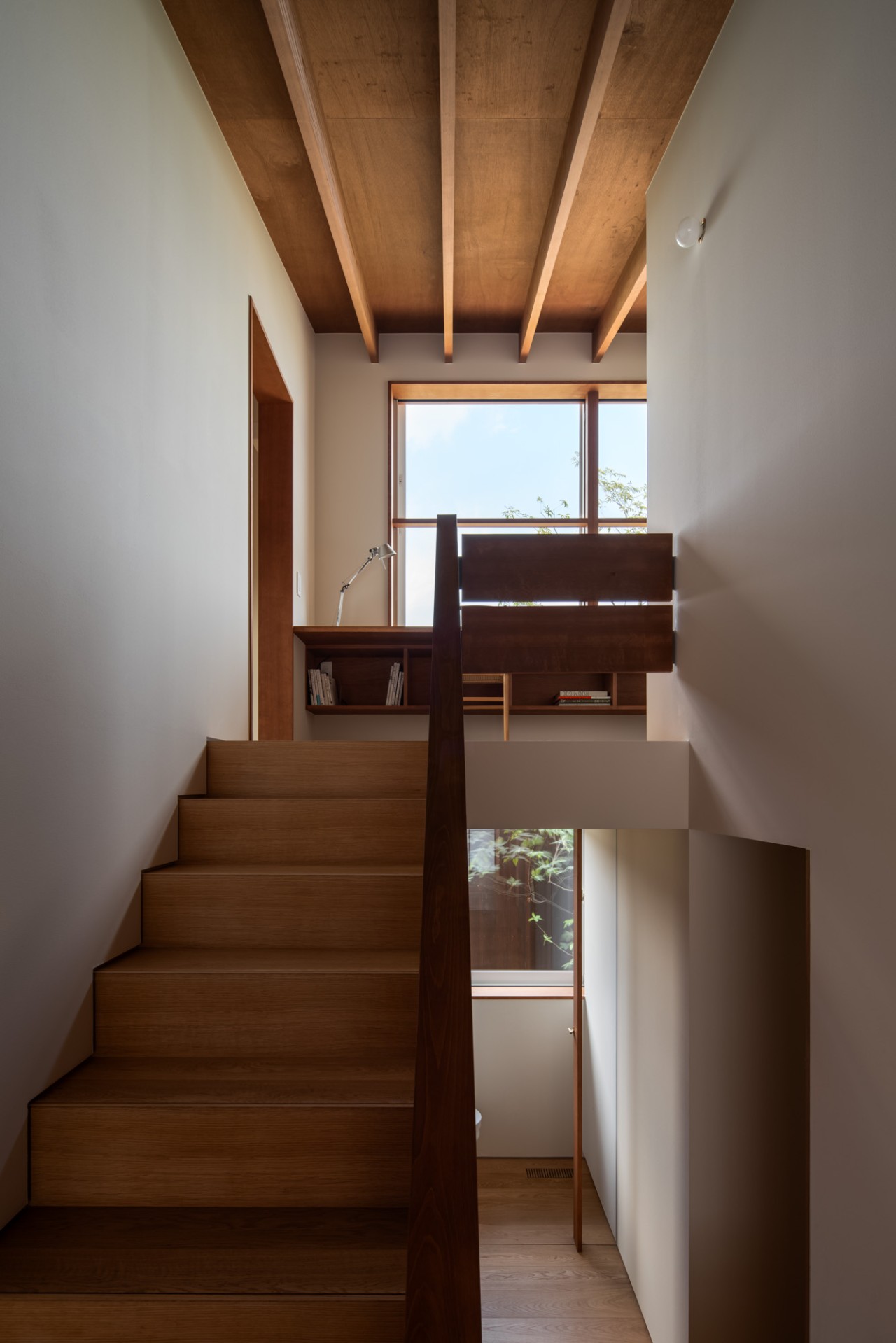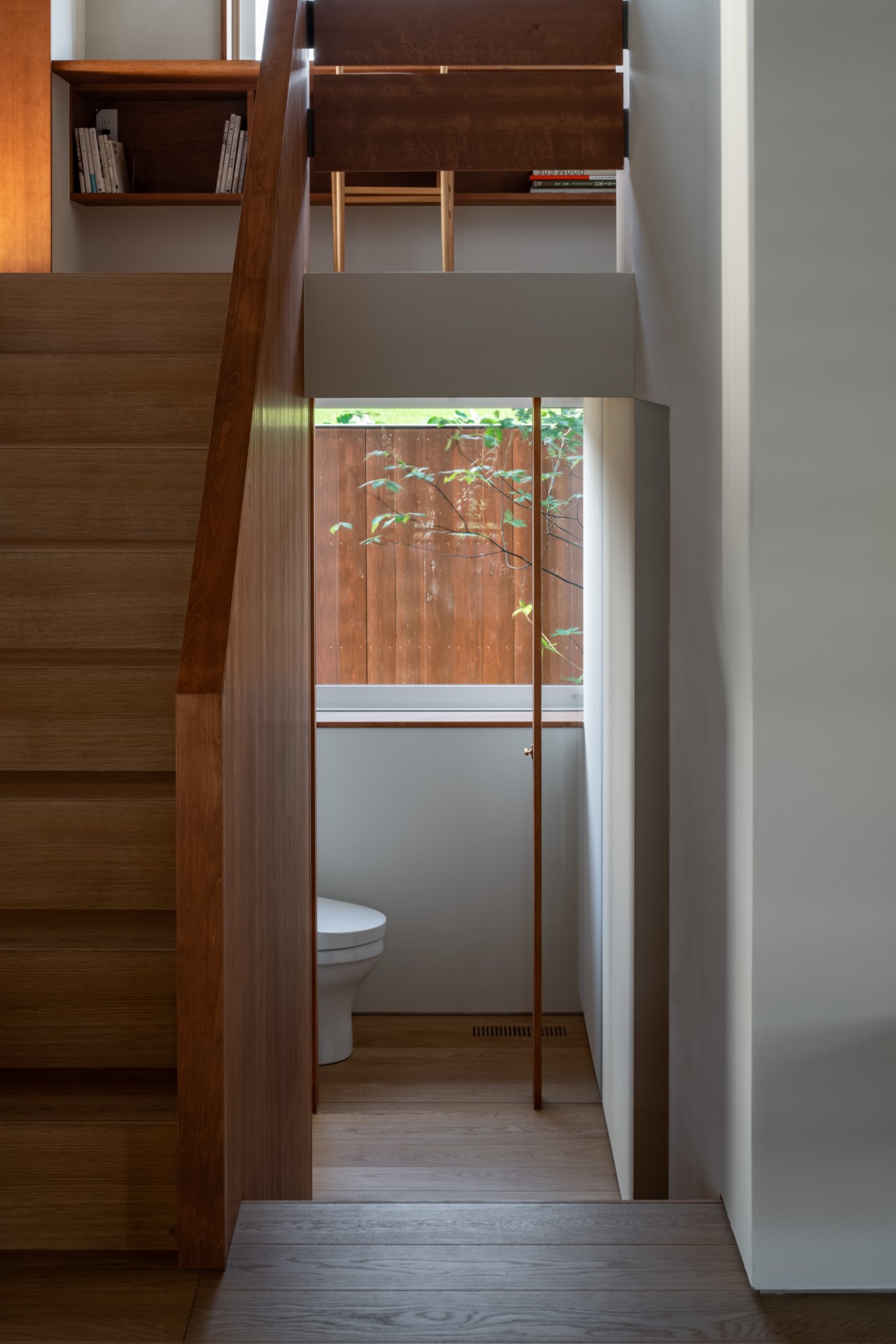 3層階のスキップフロアは、ダイニングから上を見上げればワークスペース越しに庭の樹木と空が目に映り、半地下部分にはハーフユニットバスや脱衣室、洗面、トイレ、個室と、プライベートなゾーンが並びます。